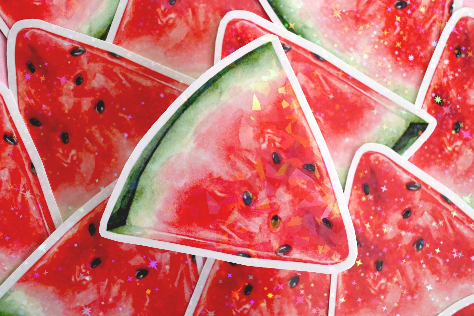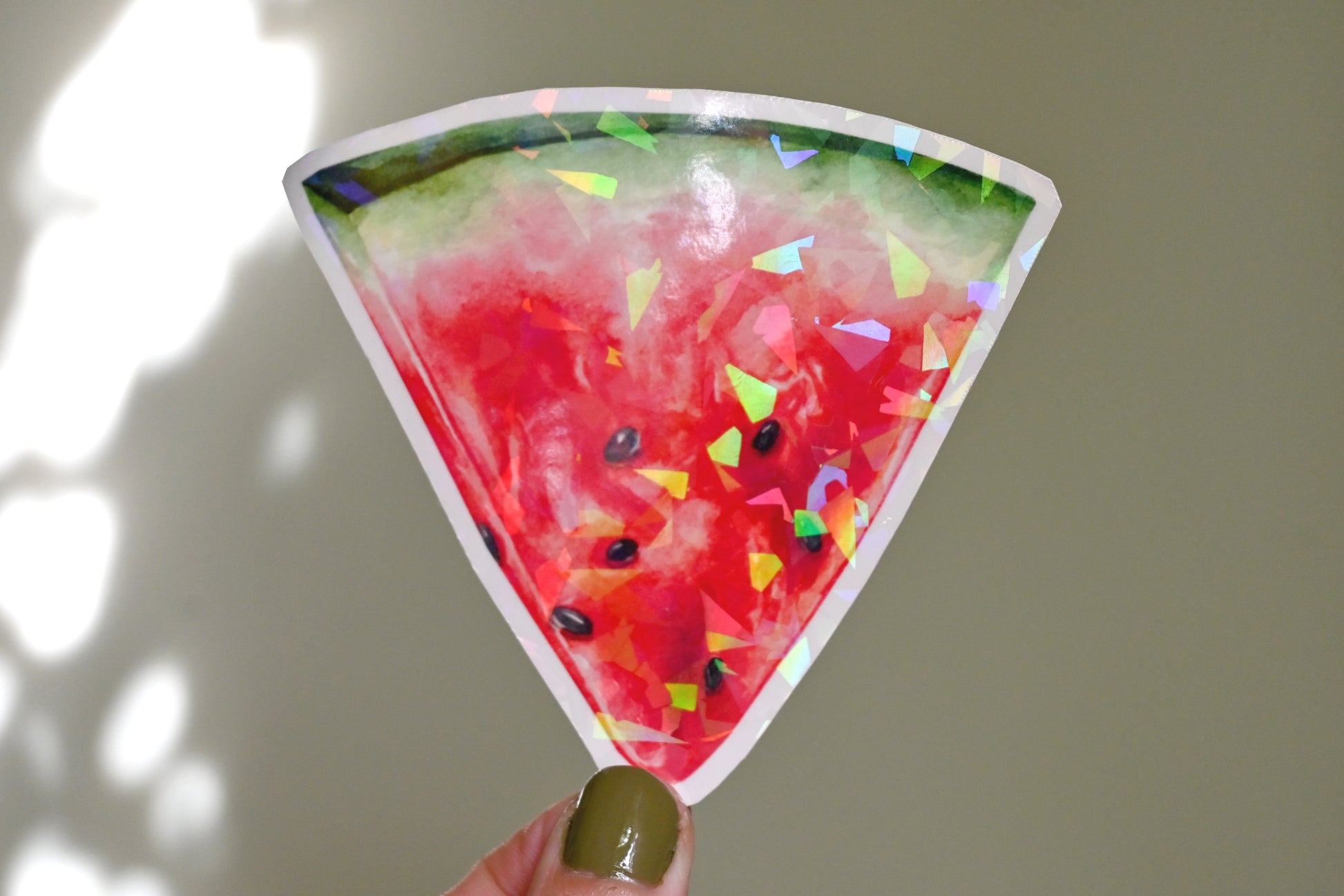 Watermelon vinyl sticker printed from one of my watercolour illustrations. The sticker measures approximately 9 x 9 cm. It is printed on tear- and water-resistant vinyl sticker paper, protected with a hollographic film, resulting in a longer lasting, shiny and thick sticker.