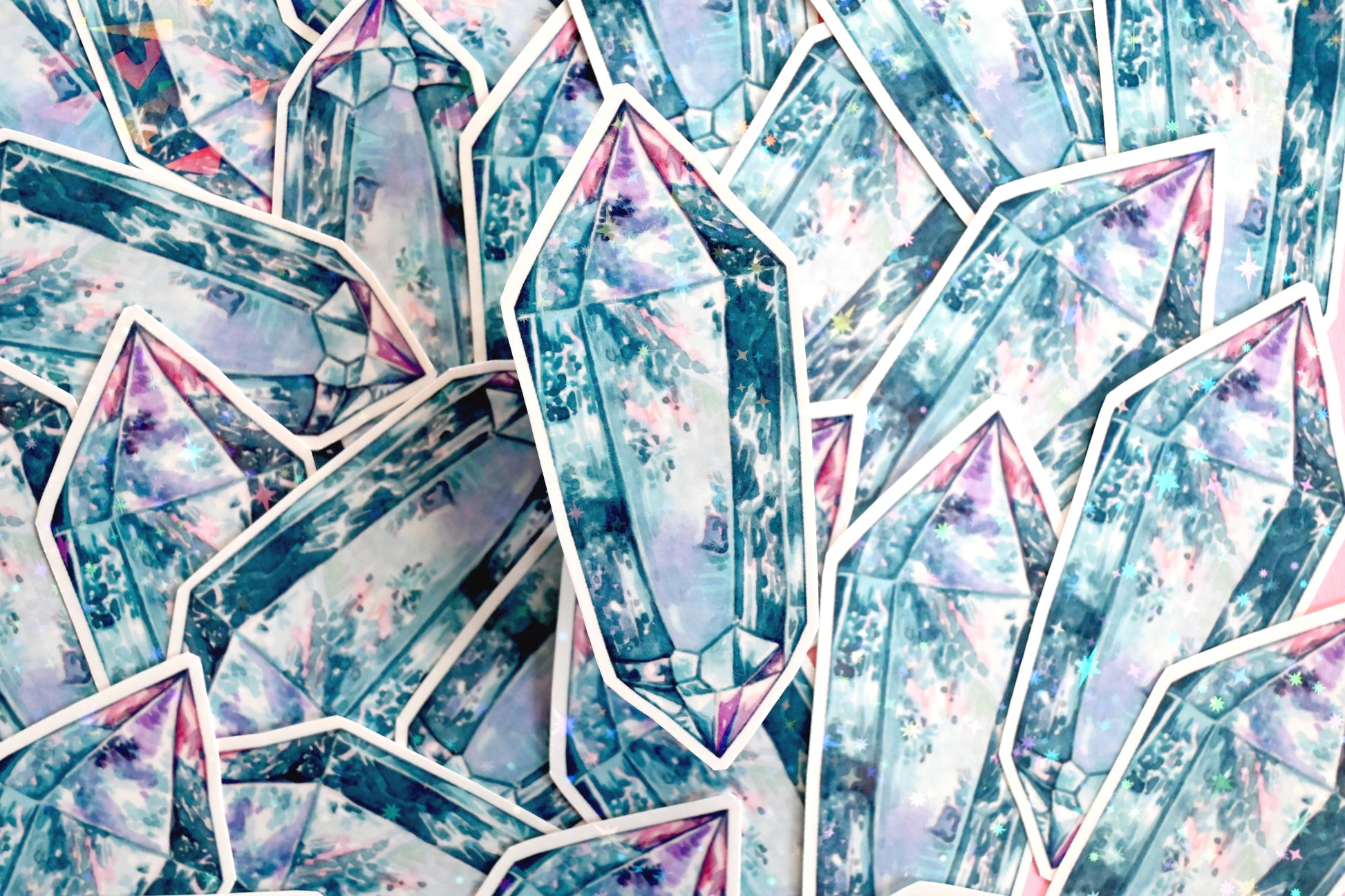 Cut Quartz vinyl sticker printed from one of my watercolour illustrations. The sticker measures approximately 4 x 9 cm. It is printed on tear- and water-resistant vinyl sticker paper, protected with a hollographic film, resulting in a longer lasting, shiny and thick sticker.