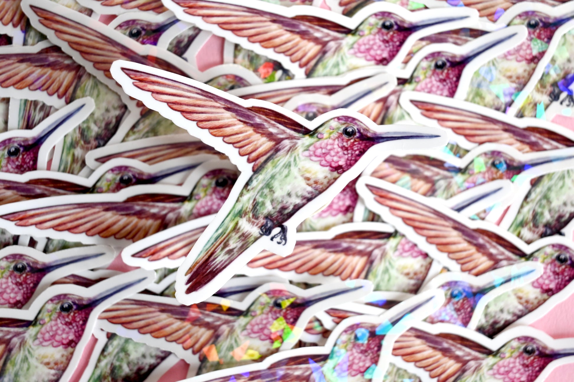 Hummingbird vinyl sticker printed from one of my watercolour illustrations. The sticker measures approximately 9 x 6 cm. It is printed on tear- and water-resistant vinyl sticker paper, protected with a hollographic film, resulting in a longer lasting, shiny and thick sticker.