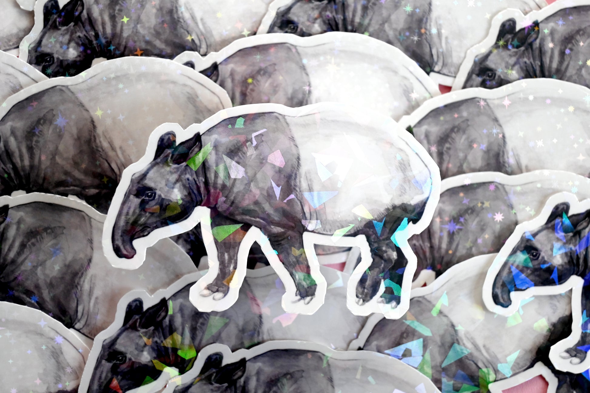 Tapir vinyl sticker printed from one of my watercolour illustrations. The sticker measures approximately 9 x 5 cm. It is printed on tear- and water-resistant vinyl sticker paper, protected with a hollographic film, resulting in a longer lasting, shiny and thick sticker.