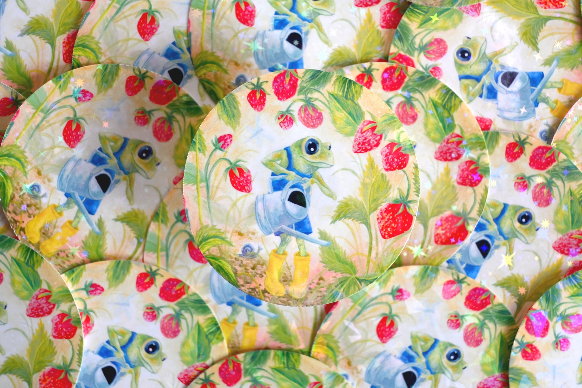Strawberry Gardener vinyl sticker printed from one of my watercolour illustrations. The sticker measures approximately 6 x 6 cm. It is printed on tear- and water-resistant vinyl sticker paper, protected with a hollographic film, resulting in a longer lasting, shiny and thick sticker.