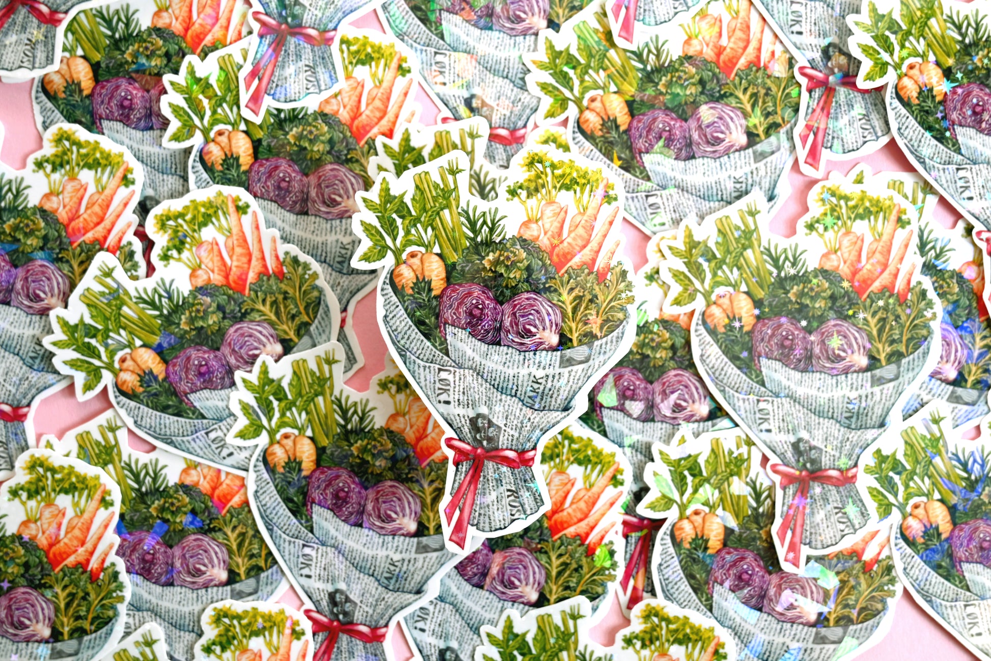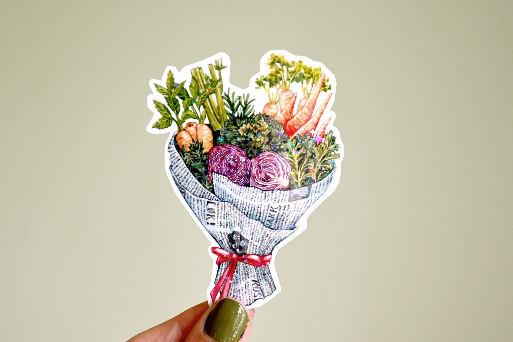 Vegetable Bouquet vinyl sticker printed from one of my watercolour illustrations. The sticker measures approximately 6 x 9 cm. It is printed on tear- and water-resistant vinyl sticker paper, protected with a hollographic film, resulting in a longer lasting, shiny and thick sticker.